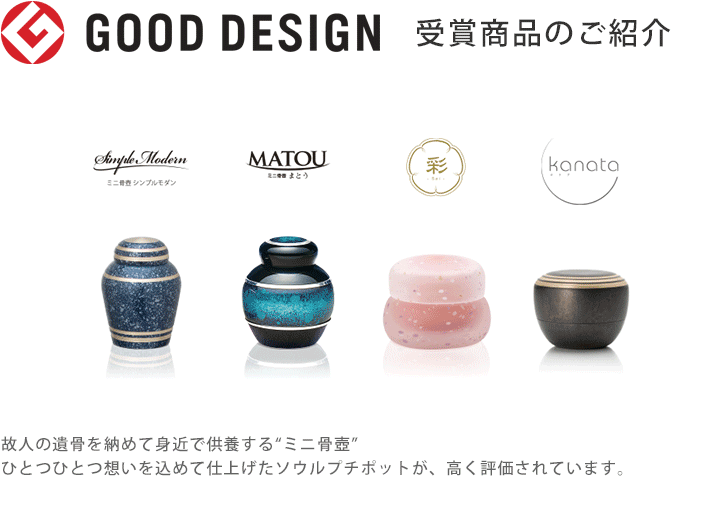 親しい人の遺骨や遺灰をいつも身近に置いておきたいというというニーズ、仏壇を置けない住宅環境に対し、住空間に溶け込む小型で美しい骨壺の提案である。装飾には伝統工芸である尾張七宝を採用し、おごそかなイメージとともに普遍性のある美しさを実現させた。量産加工処理の難しい七宝の端部を上手に隠し、手を掛けた複数の部材を組み上げながら滑らかなシルエットに仕上げた技術が高く評価された。
